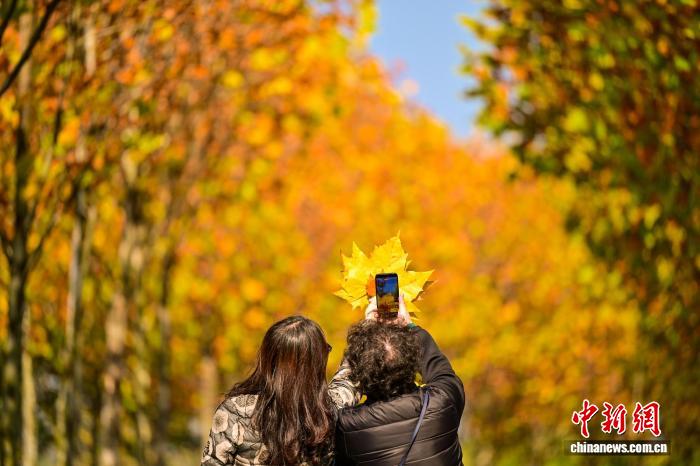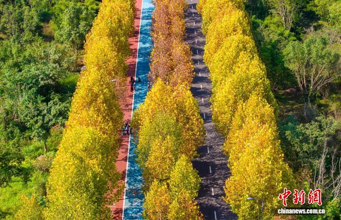 图为市平易近正在广阳岛梧桐年夜路赏景玩耍。郭旭 摄